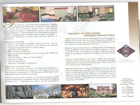 Hotel Regent is situated at the Hotel Square, Committee Chowk, Chaklala Road, Rawalpindi from where you may plan your Business trips, Conferences or visit to any part of the Northern Region full of scenic beauty connected either by road or Air. The Hotel is centrally Airconditioned ideally located in the Business Centre of Rawalpindi. 10 minutes drive from Islamabad International Airport. Hotel Regent plaza Rawalpindi has 45 spacious guest rooms elegantly decorated with modern facilities / amenities keeping in view the guests needs & comforts